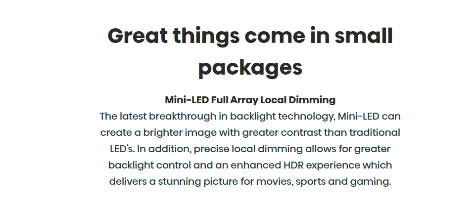 Mini-LED with Hi-View Local Dimming: Mini-LED is the latest breakthrough in backlighting technology. By utilizing LED’s that are significantly smaller than traditional LED’s we are able to use many more LED’s to create a bright image that distributes the light more evenly for a uniform image across the screen.