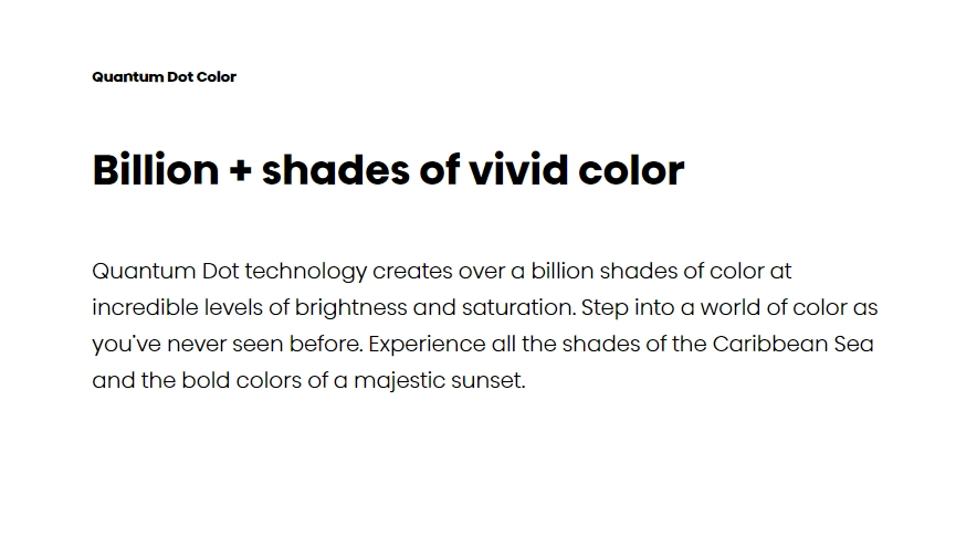 Quantum Dot Wide Color Gamut: Quantum Dot produces purer, richer, more brilliant and accurate colors than a regular LED TV. Creating over a billion color combinations bring vibrant images to life in a way non-QLED TVs can’t.