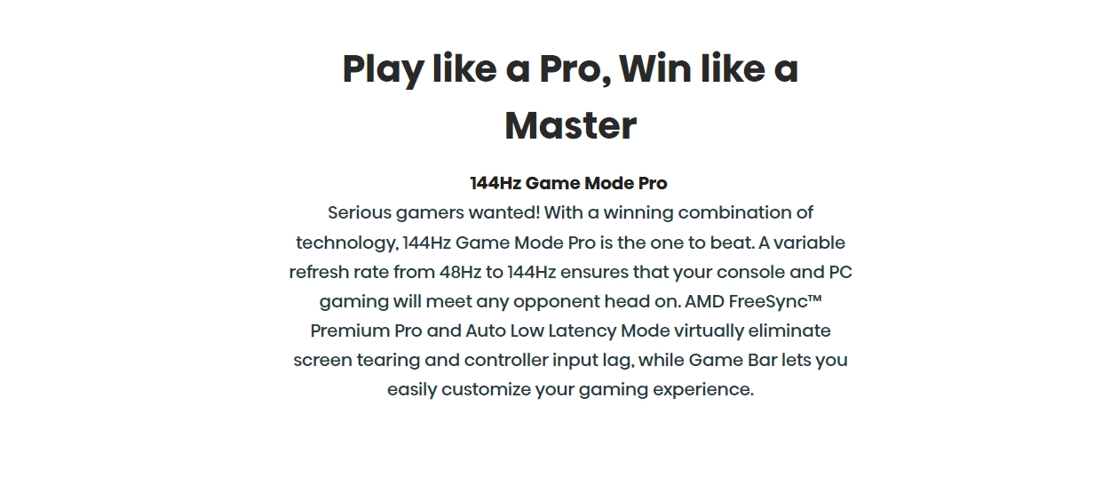 144Hz Game Mode Pro: All the most advanced gaming tech, all in this TV. HDMI 2.1 inputs recognize gaming sequences to automatically adjust settings for smooth, uninterrupted play. The automatic low-latency mode (ALLM), 144Hz variable refresh rate (VRR) minimize input lag, screen jitter, and frame tearing.