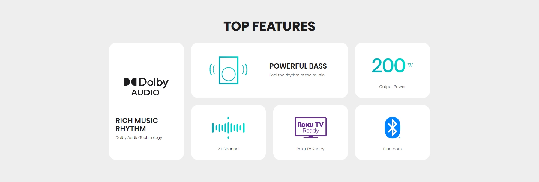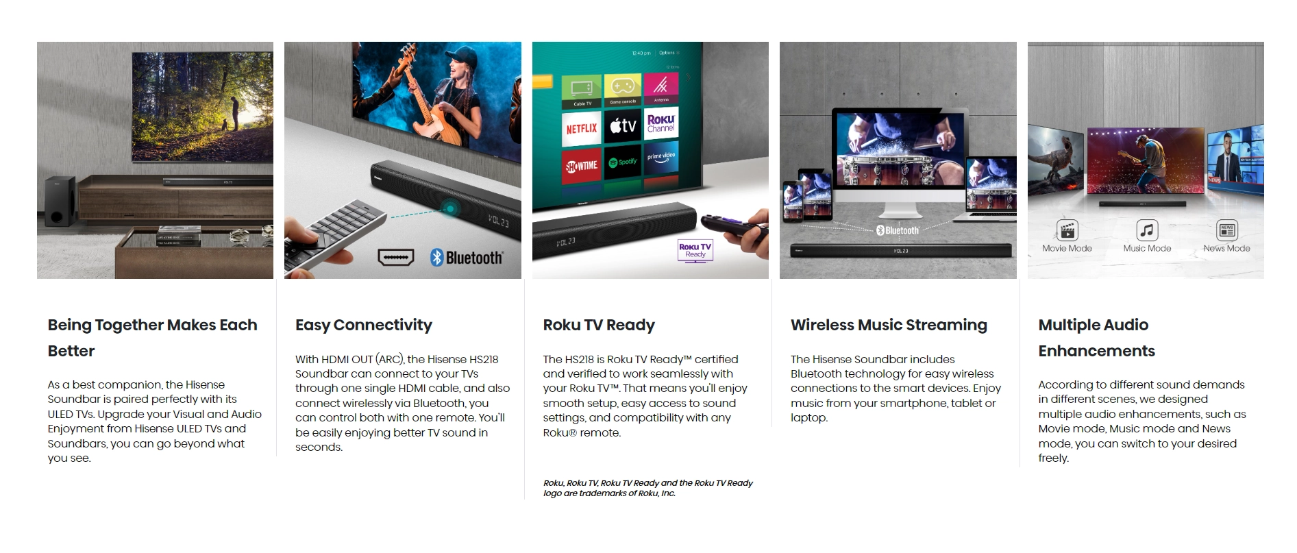 Best Match The Hisense HS218 2.1 Channel Soundbar creates incredible sound in a compact and sleek form factor. The wireless subwoofer ensures that you’ll hear and feel every “boom” your entertainment content can throw at it. The HS218 is Roku TV Ready™ certified and verified to work seamlessly with your Roku TV™. That means you'll enjoy smooth setup, easy access to sound settings, and compatibility with any Roku® remote. Big sound that delivers a huge entertainment experience.