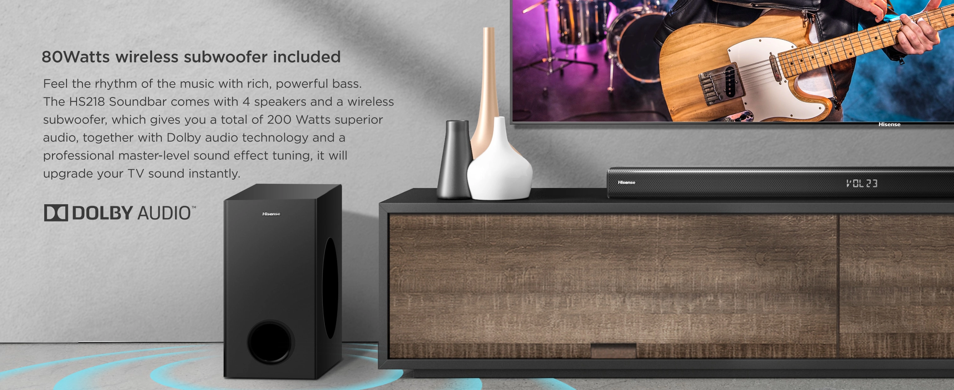 Enjoy Better Tv Sound: Hisense HS218 Sound Bar comes with 4 spearkers and a wireless subwoofer, which gives you a total of 200 Watts superior audio, together with Dolby Audio technology and a professional master-level sound effect tuning. It will upgrade your TV sound instantly.