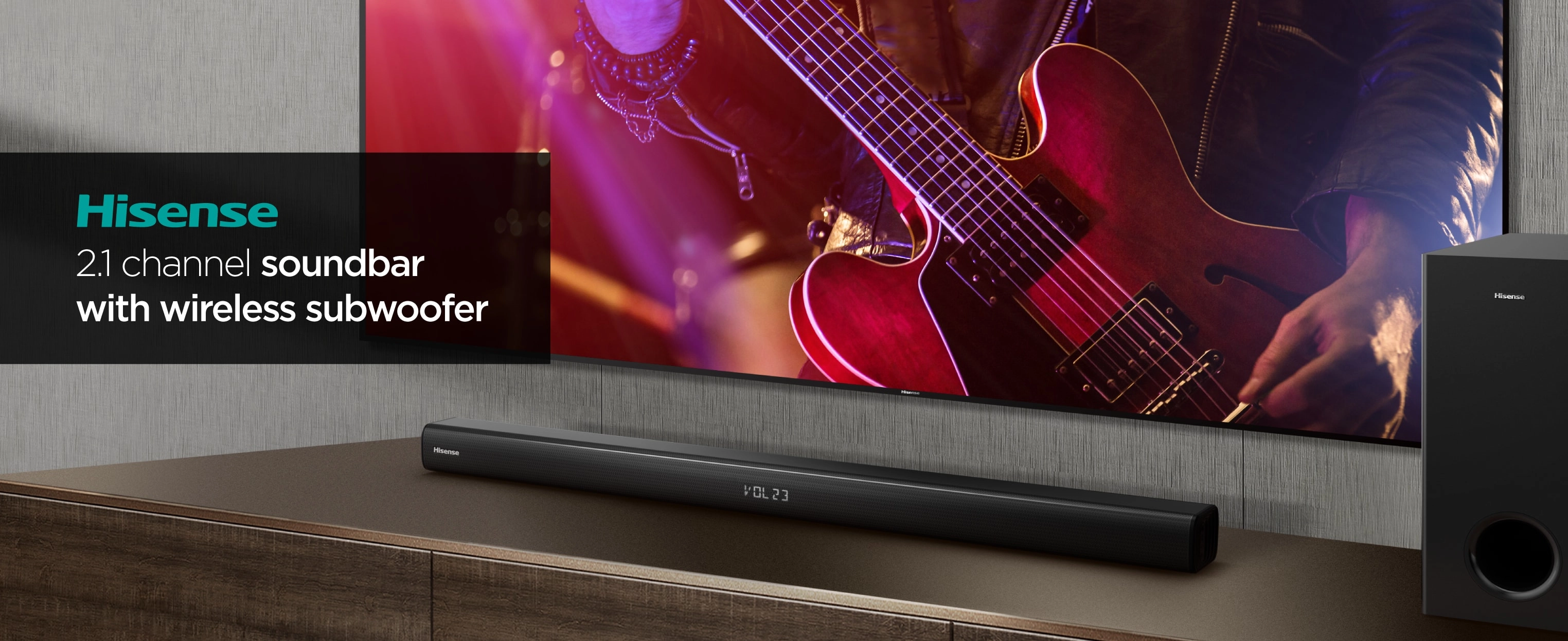 SoundbarKey Features Easy to place and connect to your television, the Hisense H218 soundbar significantly improves your TV entertainment experience and is perfect for TV’s 32” or larger. Instead of just hearing the scene, you’re transported into it. A dedicated, wireless subwoofer delivers the robust low-end frequencies that punctuate your favorite movies, music, and games, without any messy wires. You’ll feel the “boom” while the two front-facing speakers project bright, clear high-and mid-range frequencies.