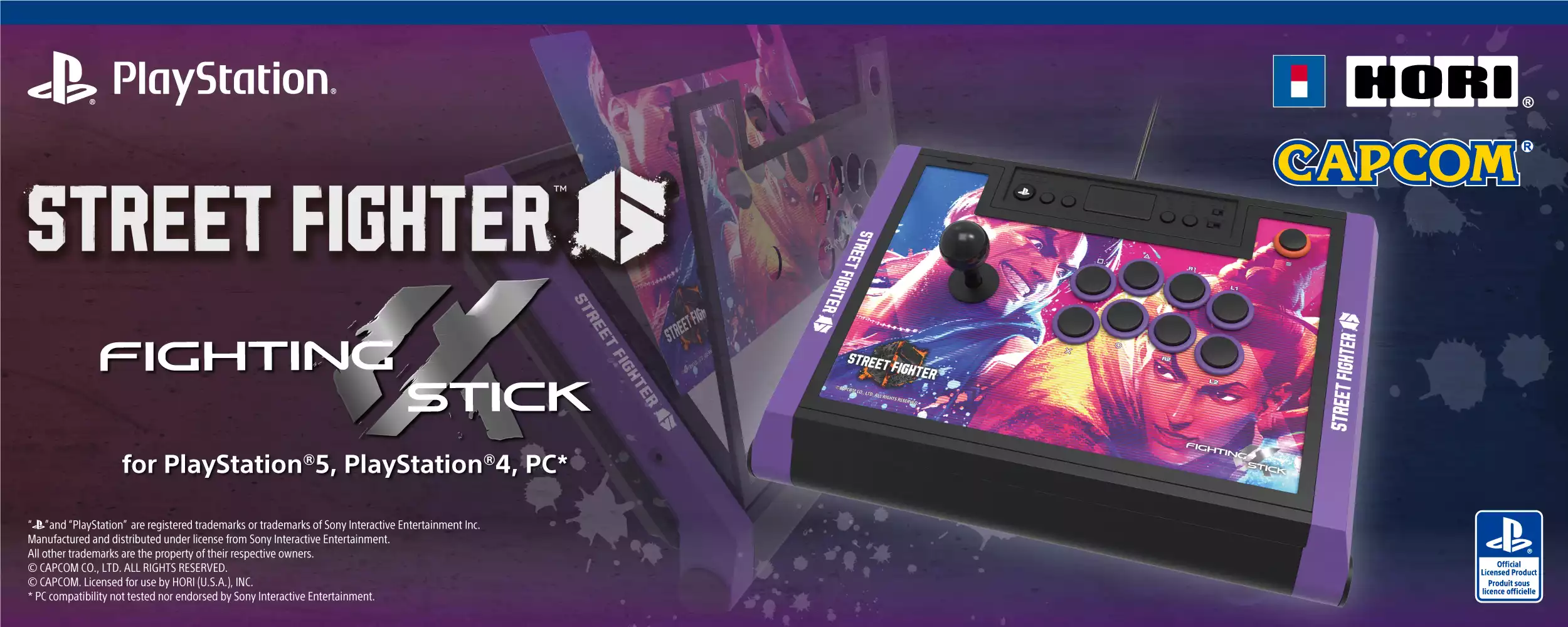 Ding Ding Ding! Introducing HORI’s Fighting Stick α (Street Fighter™ 6 Edition) for PlayStation®5! The tournament grade Fighting Stick α features Street Fighter 6 themed chassis, which can be opened for easy customization and maintenance. Also includes brand-new Street Fighter 6 artwork and a download link to 18 additional interchangeable images of the game’s starting roster. The Fighting Stick α comes equipped with HORI’s legendary HAYABUSA joystick, HAYABUSA matte high-speed buttons, fully functional touchpad, tournament lock, and a 10ft cable, as well as on-board audio and mic controls to keep all focus on the fight. Take your fighting game skills to the next level and create four custom profiles through the companion app. Easily switch between profiles on the fly using the Function Button. Play like a pro with HORI’s Fighting Stick α (Street Fighter 6 Edition). Officially Licensed by Sony and Capcom