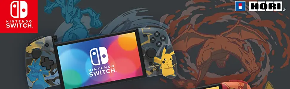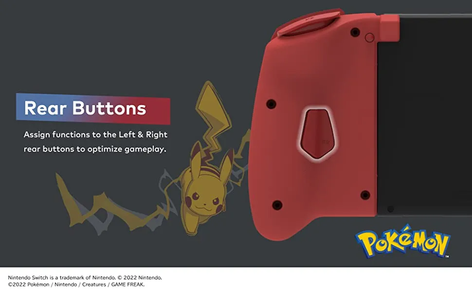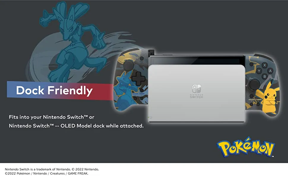 Enjoy the full-size controller experience in handheld mode with the HORI Split Pad Pro (Lucario & Pikachu)! Featuring full-size analog sticks, a precision D-pad, and large shoulder buttons, designed for comfort and accuracy, even during marathon gaming sessions. Advanced features include assignable rear triggers, turbo functionality, and more. Perfect for a wide range of genres available on the Nintendo Switch. Enjoy a new gaming experience with the Split Pad Pro! (Not a wireless controller - only for handheld mode. Does not include motion controls, HD rumble, NFC, or IR Camera.) Officially Licensed by Nintendo & Pokémon.