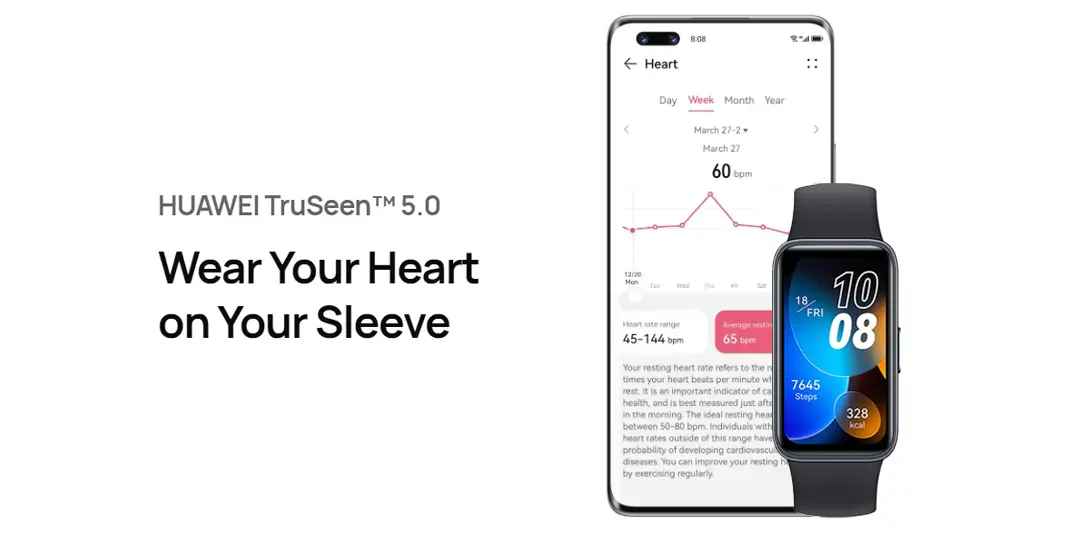 HUAWEI Band 8 features a new and improved AI algorithm that tracks heart rate round the clock and tells you right away if something is abnormal8. The system shows you your resting heart rate data for the past 7 days in intuitive graphs, and provides healthy heart rate zones and upper limit reminders during workouts.