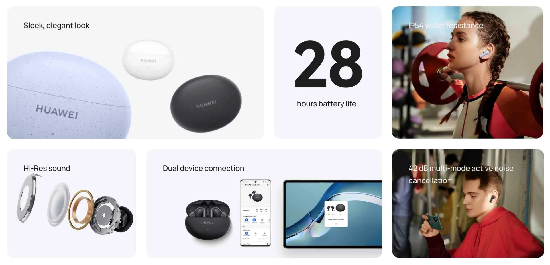 Introducing the Huawei FreeBuds 5i—the ultimate wireless earbuds experience delivering unprecedented levels of audio quality and multi-mode active noise cancellation. With 42dB of Multi-Mode Active Noise Cancellation, focusing on what matters has never been so easy: just enjoy sound at its fullest with remarkable crispness, clarity, and immersive performance. Playback time is extended to 28 hours through the charging case – staying in your listening zone for longer! The dual device connection feature gets you connected to two devices simultaneously while seamless switching between them is a breeze through a single button press. Volume control can be handled via swapping or long pressing with different control options; it’s customizable to your preferences! And the highlight of this product is IP54 water resistance that protects against sweat and accidental spills – allowing for worry-free use in almost any environment. But that’s not all – enjoy the high-resolution sound from every playback along with low latency gaming mode; all packed with advanced processing allowing for complete automation! Enjoy uncompromising sound without compromising your lifestyle with Huawei FreeBuds 5i.