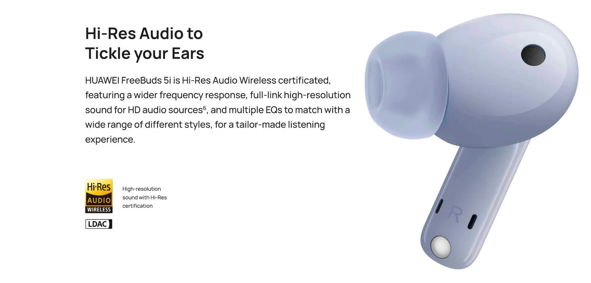 The HUAWEI FreeBuds 5i makes it possible to customize the sound with Hi-Res Audio Wireless certification, delivering high-definition audio and wide frequency response. The multiple EQs allow for the perfect listening experience no matter what your musical style is - each one is tailored to you!