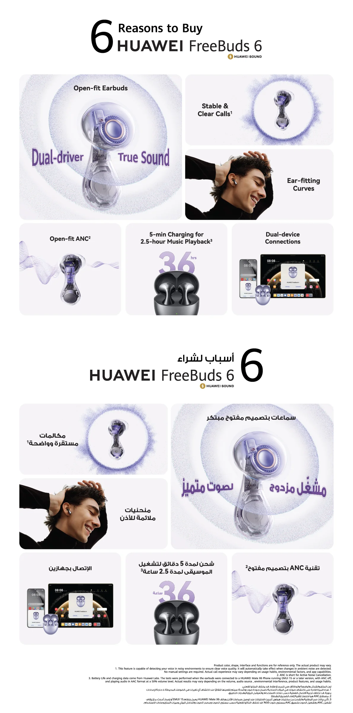 *The battery life and charging data come from Huawei lab tests. During the tests, audio in AAC,L2HC or LDAC format was played at 50% volume level. The default settings were used for other features. Actual results may vary depending on the volume, audio source, environmental interference, product features, and usage habits.