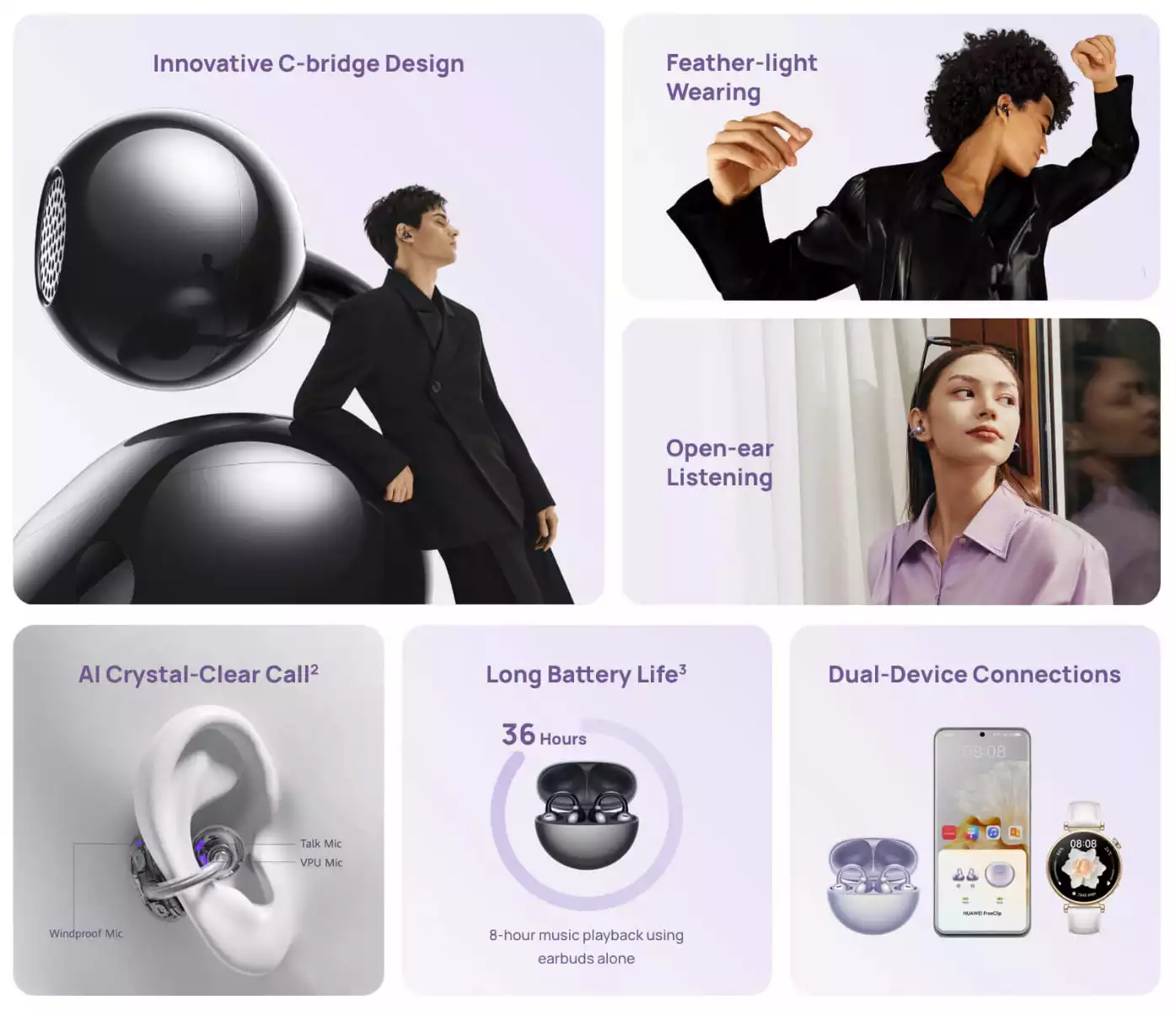 Discover the HUAWEI FreeClip , boasting an ingenious C-bridge design for ultra-light wearing comfort. Embrace open-ear listening technology for heightened awareness, coupled with AI-powered crystal-clear calls for seamless communication. With its long-lasting battery life, immerse yourself in uninterrupted audio enjoyment all day long.