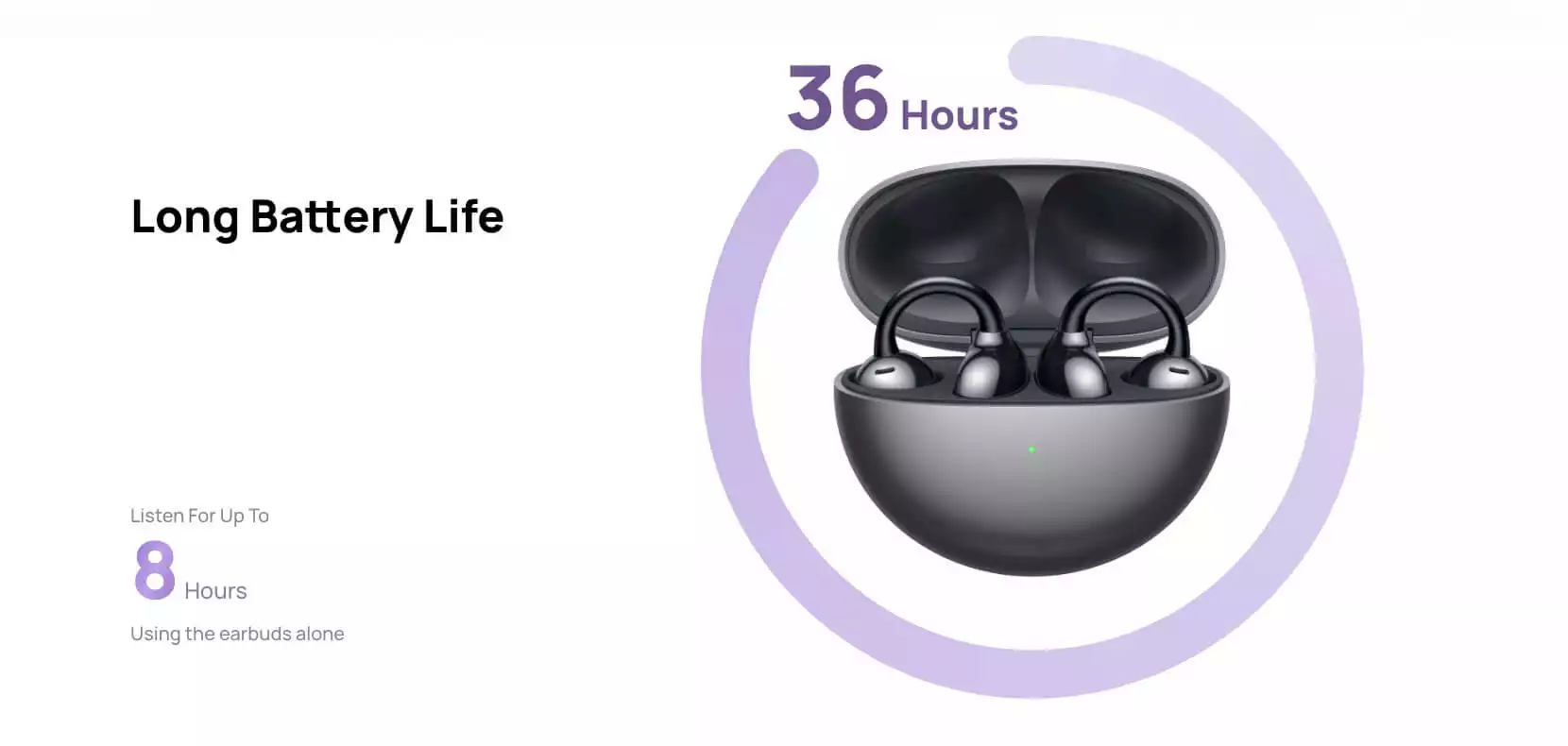 Music playback: 8 hours after a full charge and 36 hours when used with the charging case