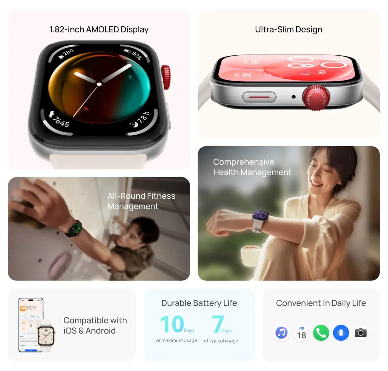 Experience the sleekness of the new HUAWEI WATCH FIT 3, measuring just 9.9mm thin and weighing only 26g. With its aluminum alloy body and stylish metal buckle, this smartwatch is as cool as it gets.