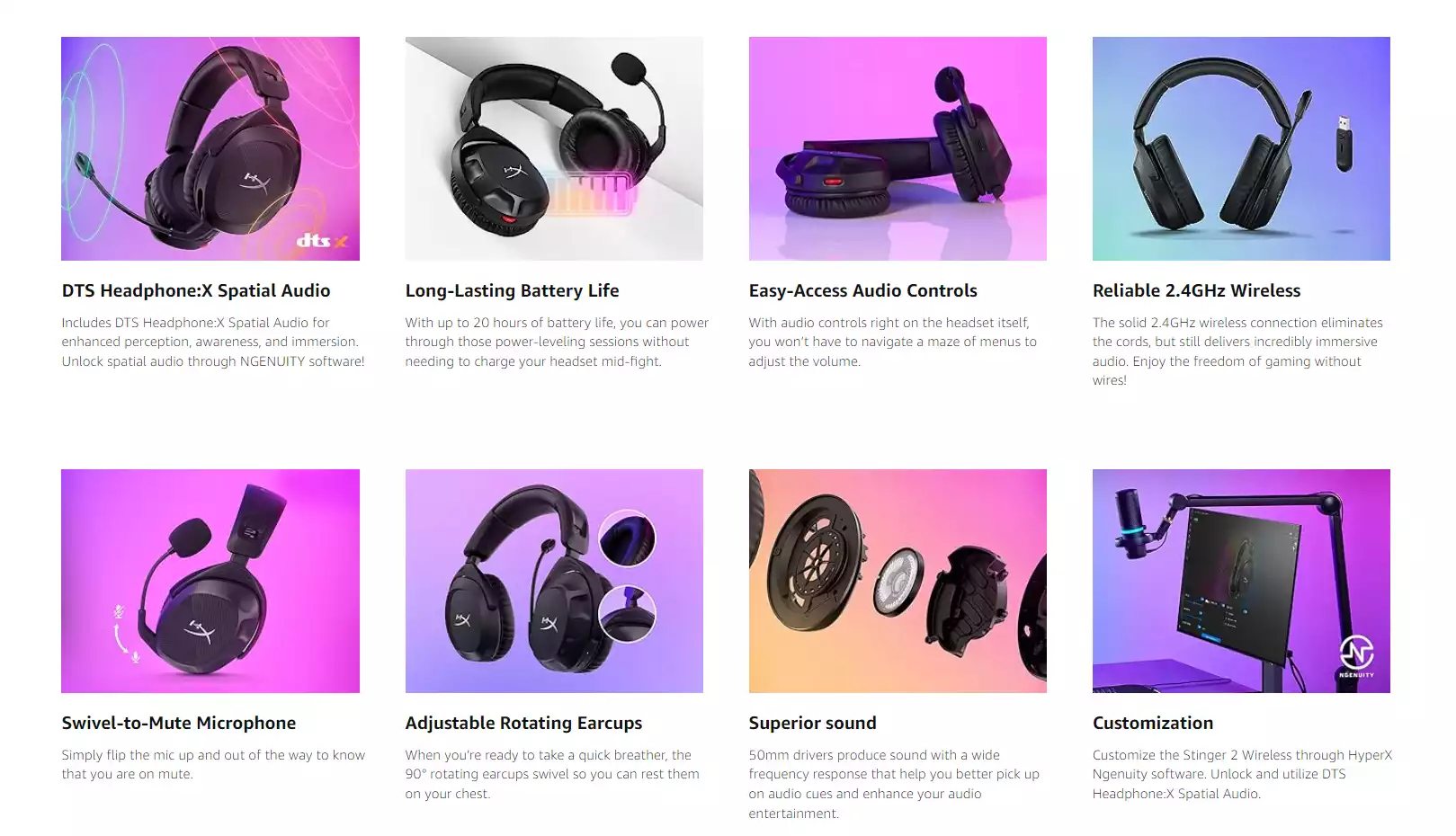 Get the HyperX Cloud Stinger™ 2 Wireless Gaming Headset and enjoy signature Cloud comfort paired with the wireless freedom of a robust, reliable 2.4GHz wireless connection. Enhance your gaming and audio entertainment with the power of DTS® Headphone:X® Spatial Audio[1] which delivers precise sound localization and incredibly immersive audio. Just plug the adapter into an available USB port, and you are ready for gaming, remote classes, or chatting online with friends. With signature HyperX comfort and a long-lasting battery (up to 20 hours on a single charge[2]) this wireless headset is built to keep the good times going throughout the night. When you are ready for a break, the ear cups rotate 90 degrees, so you can rest the headset comfortably around your neck. The closed cup design and 50mm drivers pump out crisp, clear audio to keep you engaged in your intense team fights. It includes several gamer-friendly conveniences, like on-ear cup volume controls to give you direct access to headset volume and a swivel-to-mute mic to quickly silence yourself.