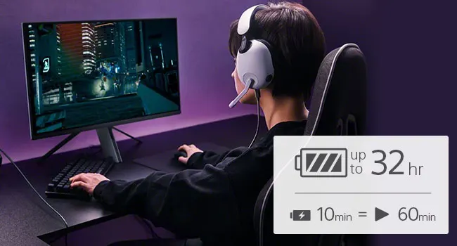 Marathon gaming is no match for this kind of power. Get up to 32 hours of continuous play (with Noise Canceling OFF) from a single charge. In case of emergency, get up to an hour of game time for a quick 10-minute mini-charge. Play while charging—a long USB cable keeps you in the game.