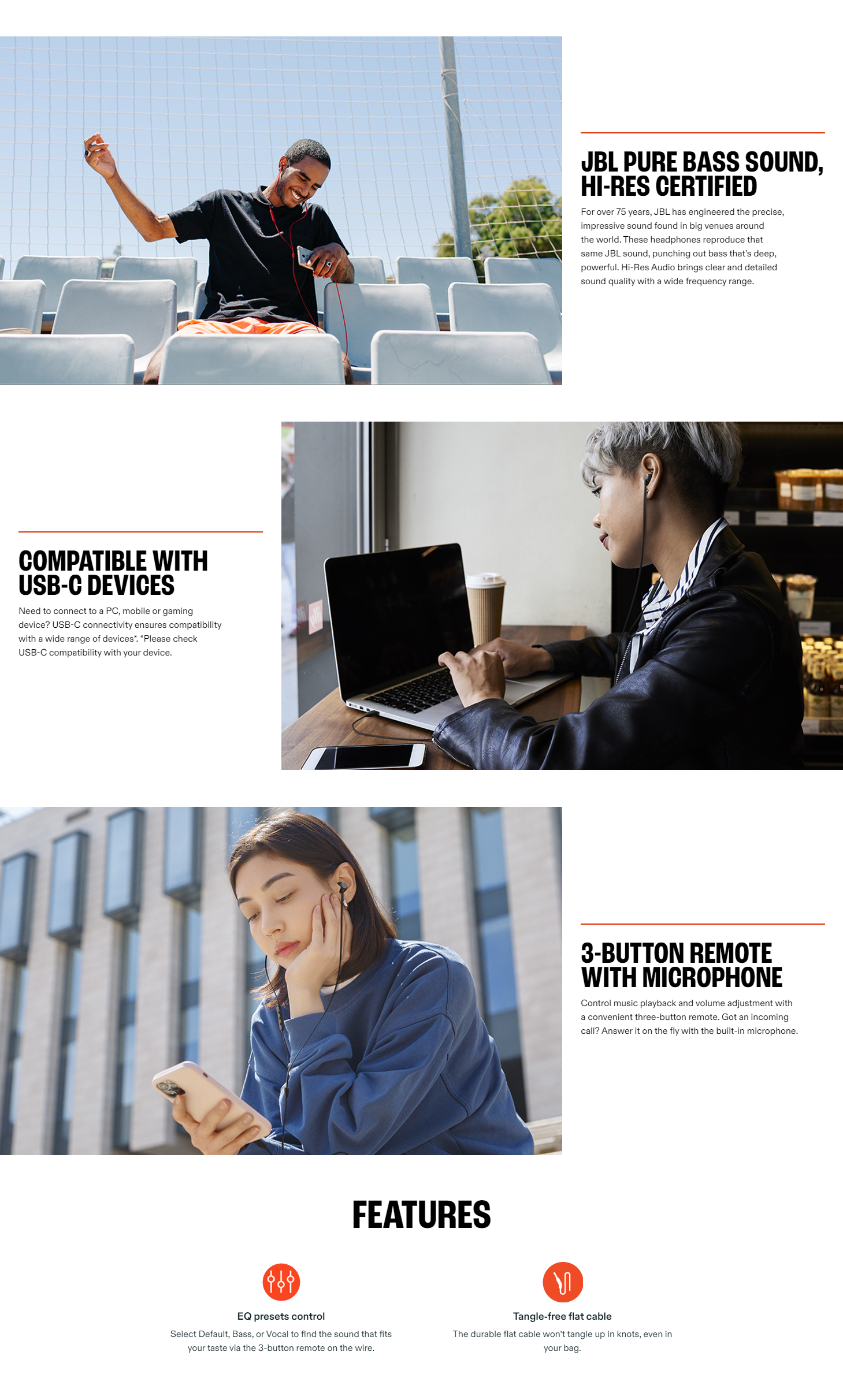 Introducing JBL Tune 305C USB-C earbud headphones. They’re lightweight, comfortable and compact. A pair of 12.5mm dynamic drivers punch out powerful JBL Pure Bass Sound, while the High-Resolution Audio support ensures great sound quality. A USB-C connection makes them compatible with a large variety of devices like PCs, mobiles, and gaming devices. In addition, the three-button remote on a tangle-free flat cable lets you control music playback and volume adjustment, EQ presets, as well as answering calls on the fly with a built-in microphone. All this makes the JBL Tune 305C USB-C your everyday companion, at work, at home, and on the road.
