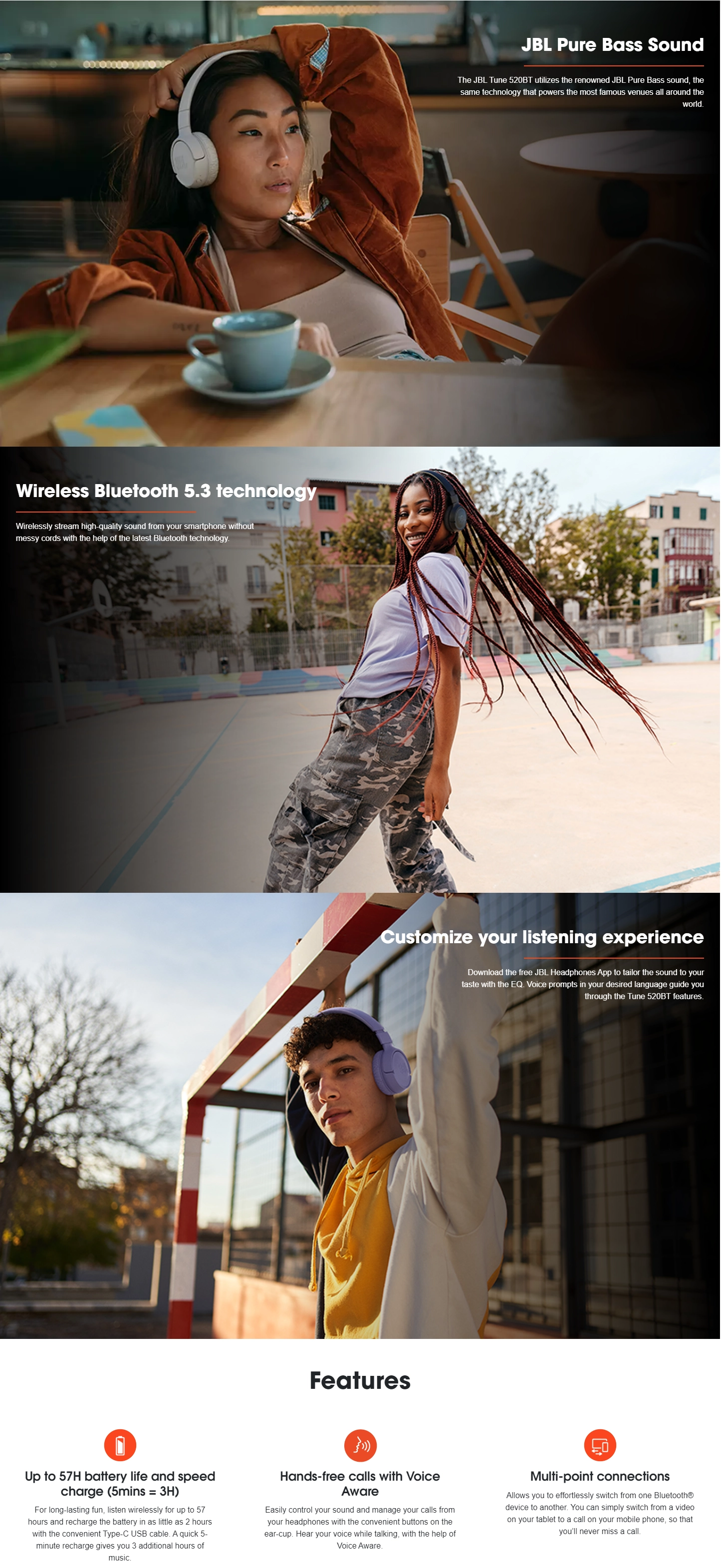 The JBL Tune 520BT headphones stream powerful JBL Pure Bass sound thanks to the latest 5.3 BT technology. Easy to use, these headphones provide up to 57 hours of pure pleasure and an extra 3 hours of battery with just 5 minutes of charge. Download the free JBL Headphones App and customize your sound through the EQ, while Voice Prompts guide you through the headphones features. Manage calls, sound and volume from the earcup, thanks to the convenient button control. If a call comes in while you are watching a video on another device, the JBL Tune 520BT seamlessly switches to your mobile device, so you never miss a call. Lightweight and comfortable even after hours of listening, the JBL Tune 520BT headphones fold flat in your backpack to follow you everywhere.