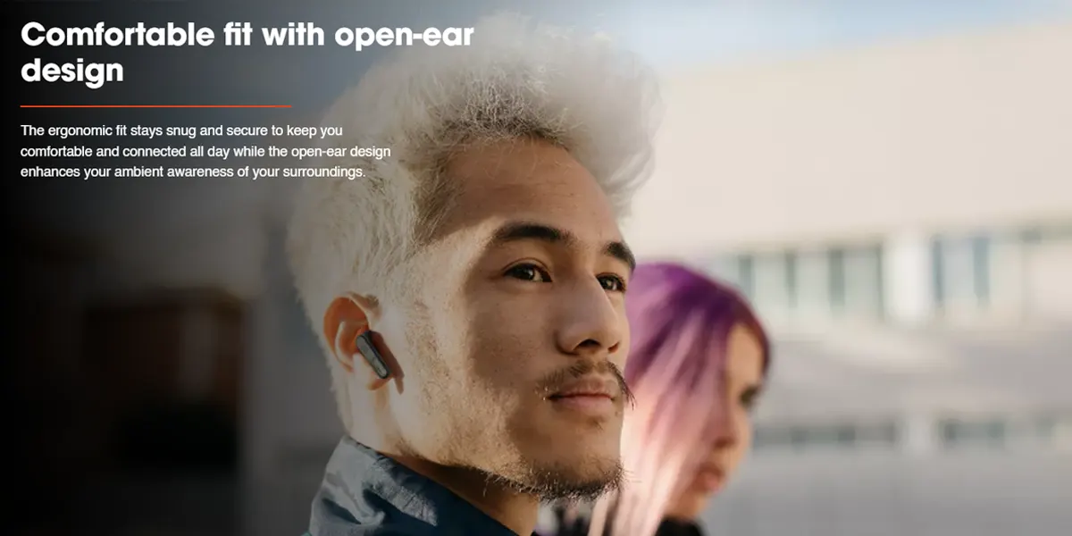 The ergonomic fit stays snug and secure to keep you comfortable and connected all day while the open-ear design enhances your ambient awareness of your surroundings