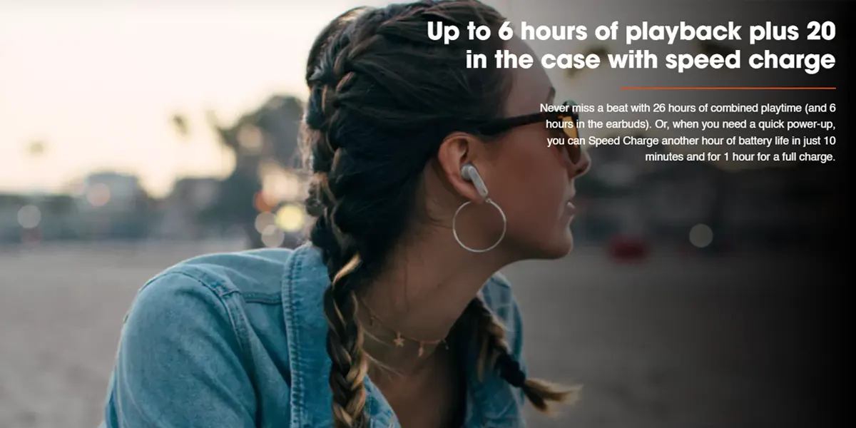 Never miss a beat with 26 hours of combined playtime (and 6 hours in the earbuds). Or, when you need a quick power-up, you can Speed Charge another hour of battery life in just 10 minutes and for 1 hour for a full charge