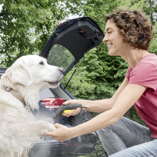 Efficient, but gentle low pressure Low pressure offers the advantage that cleaning is both efficient and extremely gentle at the same time. The standard nozzle with flat jet makes possible a visible cleaning performance. The cone jet nozzle is for even more sensitive cleaning of, for example, dog paws.