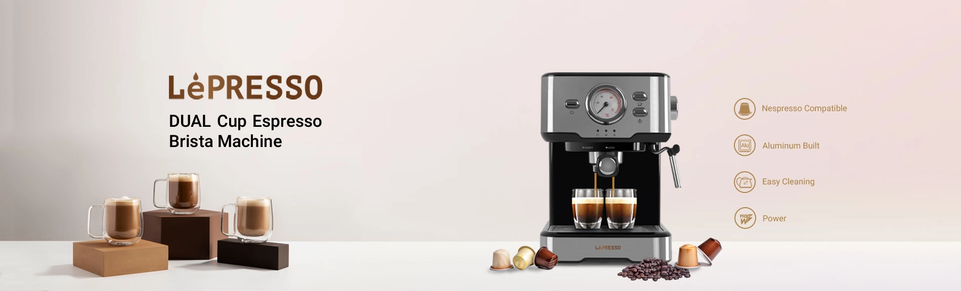 LePresso Dual Cup Barista Espresso Machine with Steam Milk Frother and Nespresso compatibility is a compact easy-to-use product suitable for daily coffee making purposes at home and in office. With Steam Wand, it can help you to make not only latte and cappuccino, but also, hot chocolate and tea. Its small size gives you the ability to flexibly fit it in to any cabinet or counter no matter how much space you have. In this overview, we are going to delve in the key features, performance, and usability, so by the end it, you will be able to make a wise choice.