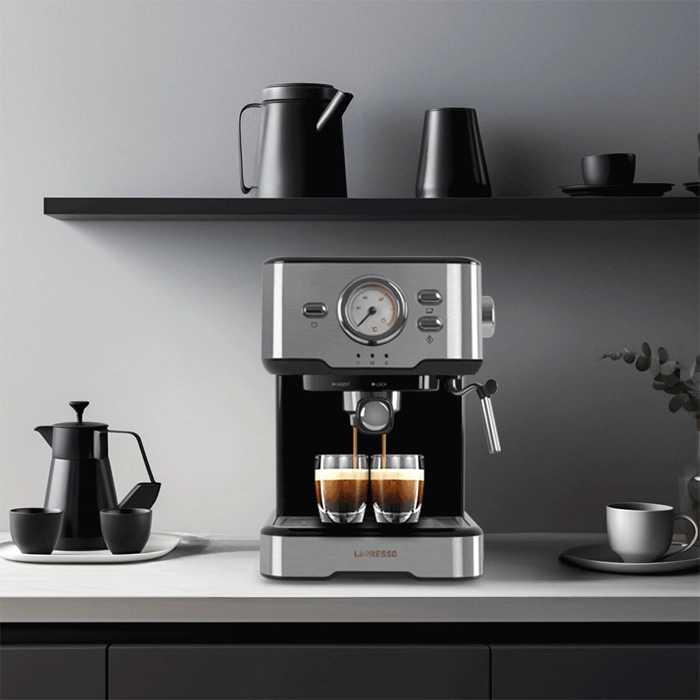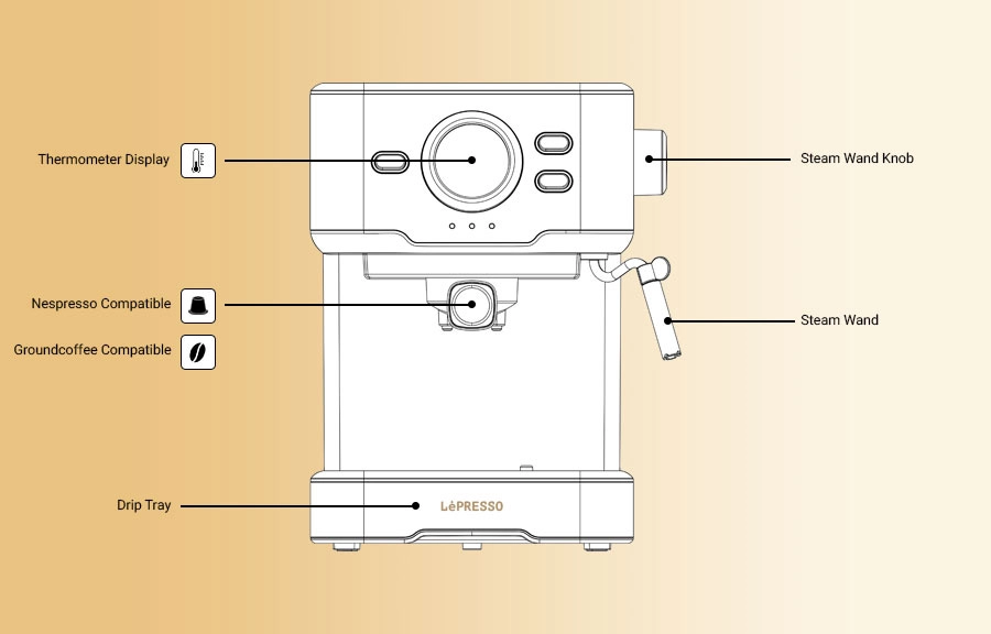 In order to have a more professional versatile function of the steaming wand the device is supplied with a knob on the left. By rotating it you are able to have different pressure pomp from 9 to 15 Bars. Although this feature is commonly used in industrial coffee machines, LePresso used it in this Dual serving espresso machine to give the users the ability to taste Barista style coffee at home.