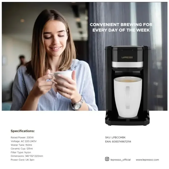 Product NameLepresso One Cup Coffee Maker - 330-350W - 125ml (LPBCCMBK)