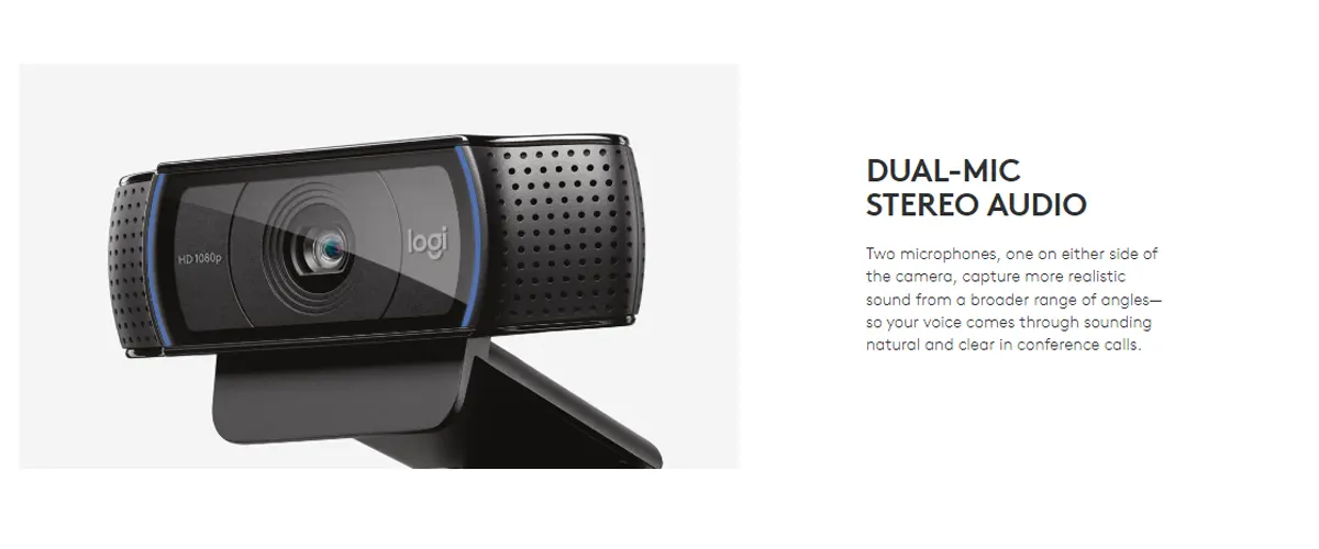C920 delivers remarkably crisp and detailed Full HD video (1080p at 30fps) with a full HD glass lens, 78° field of view, and HD auto light correction—plus dual mics for clear stereo sound. Everything you need to look great in conference calls and record polished demos.