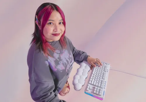 G713 will support you in play. That’s why our cloud-like palm rest is included to complete the dreamy desktop vibes. Save the day and your desktop with a compact, tenkeyless footprint. Your mousepad will thank you. And make sure your fingers are relaxed and ready to explore with adjustable height feet. All-day play? Yes, please