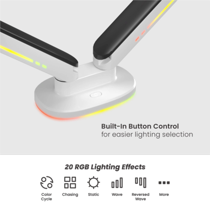 FEATURES ●RGB Multi-Color Lights: offer cool ambient lighting ●Detachable VESA Plate Design: enables easy installation ●Built-in Cable Management: for an organized and neat workspace ●Built-In On/Off Break Switch: easily activates and deactives the power ●Built-in Spring Tension Mechanism: for perfect weight adjustments ●Integrated 270° Rotation Stop: prevents monitor arm from swinging into screens or walls