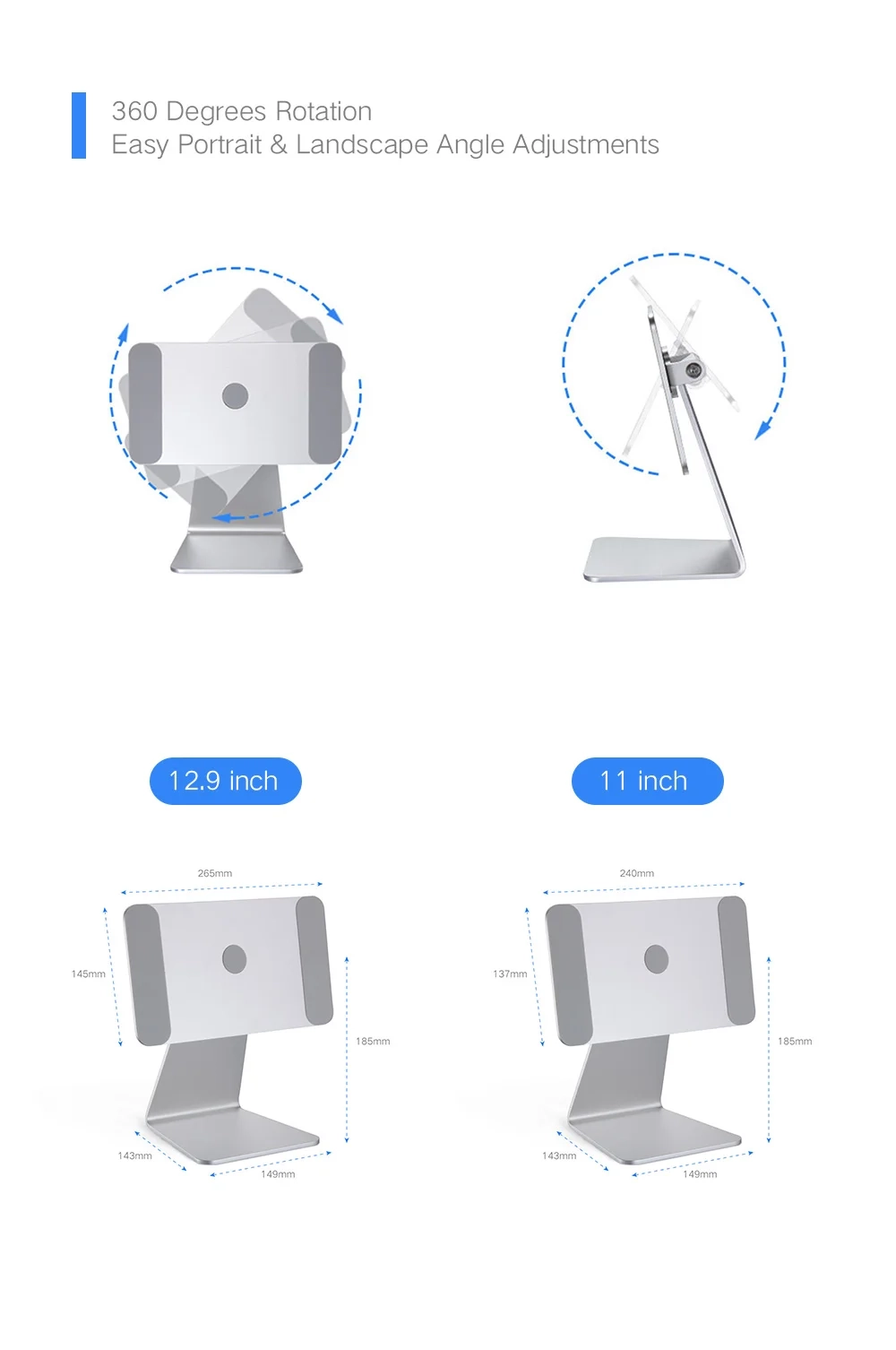 For iPad Pro 11: Fit for iPad Pro 11'' 1st/2nd/3rd Generation For iPad Air:Fit for iPad Air 4th Generation Advanced Magnetic Attachment:With strong magnetic built in a perfectly layout to align tablet, the magnetic holder For iPad can attach and hold your tablet securely and precisely in place. Protective anti-slip silicone will safeguard your tablet from accidental scratches. Angle Adjustments: Other than typical portrait and landscape viewing, the magnet holder is designed for 360° angle adjustment for rotation, and ranging from -20° to 200° for holder board adjustment. Great Stability: With improved base, it’s durable, stable and sturdy enough to support your tablet’s weight, while maintaining an elegantly space-saving, modern design for computer desk. Non-slip silicone feet in the bottom highly improve the stand’s stability. Reliable Material:The Tablet holder for iPad is made of high-quality aluminum alloy with great robustness and protective thickness 5mm for durability that lasts for ages. Note: For iPad cases with thickness from 0.8mm to 1.2mm, the magnetic absorption will be comparatively weaker. Works well with Double-sided magnetic cases. For iPad Pro 12.9 2021, temporary can't use with case on.