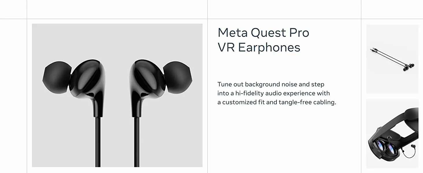 Tune out background noise and step into a hi-fidelity audio experience with a customized fit. Separate right and left earphones with optimized cord lengths connect to either side of the headset to keep cabling out of your way for a tangle-free VR experience. Dual audio drivers deliver our widest dynamic range yet and ambient noise isolation minimizes background noise for a detail-rich, immersive sound. Personalize your comfort with a choice of three different eartip sizes to sit gently in your ears while further reducing outside noise. Designed for use with Meta Quest products and accessories, these earphones work with Meta Quest Pro light blocking accessories in place.