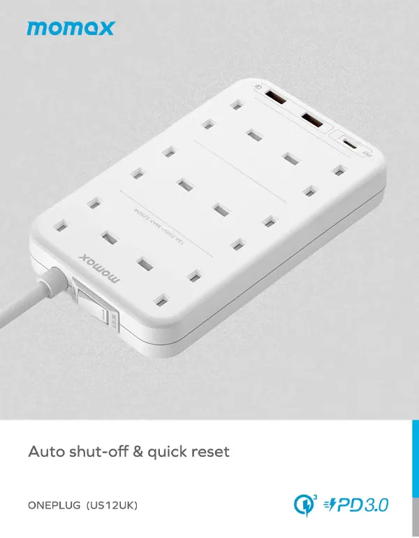 US12UK is a 6-outlet power strip with 2 QC 3.0 USB ports and 1 PD3.0 USB-C port. It provides high speed charging performance and enable fast charging for your devices. The dual-rows design can help you save space at your home. It can offer stable and fast power output for up to 9 devices at the same time.