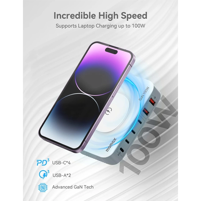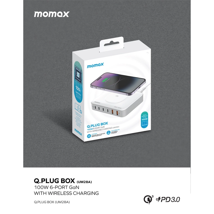 Shop online Momax - Oneplug Gan 100w 6-port Gan With Wireless Charging-white and free same day delivery from Alfuhod in Kuwait.