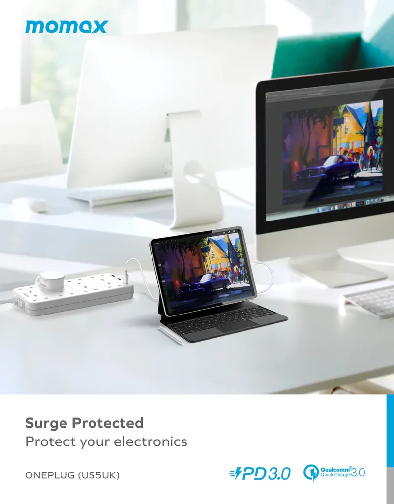 Momax ONEPLUG PD20W 2A1C is an 8-outlet power strip with 2 QC 3.0 USB ports and 1 PD3.0 USB-C port. It provides high speed charging performance and enable fast charging for your devices. The dual-rows design can help you save space at your home. It can offer stable and fast power output for up to 11 devices at the same time.