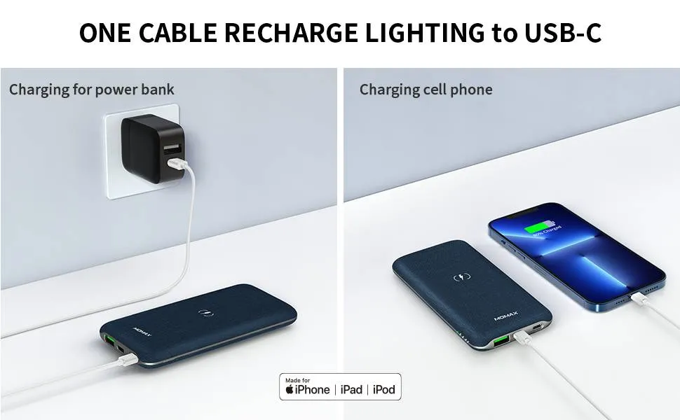 Supports lightning input which allows for using the same Lightning cable or Lightning to USB-C cable to charge your iPhone and power bank.