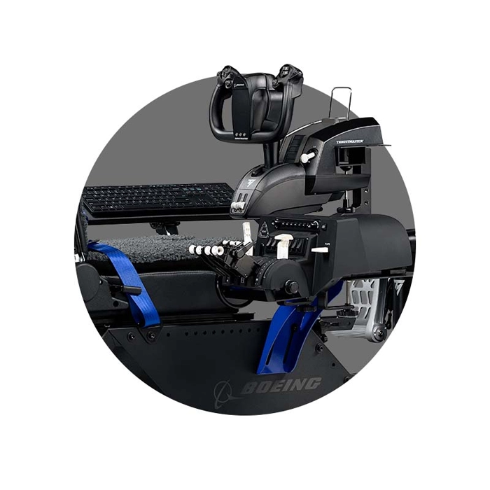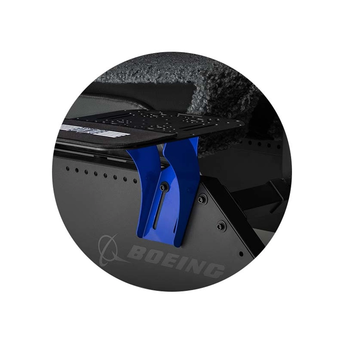 The Next Level Racing Flight Simulator Boeing Commercial Edition cockpit has been specifically designed and developed with flight users in mind. The Flight Simulator is the first flight cockpit that allows different flight configurations all in one station. With different components included with the Flight Simulator, the flight user can create a commercial flight configuration by attaching a wide range of yokes, rudders, and throttles directly to the cockpit. A military configuration is possible with a unique cut-out design of the seat to attach the Hotas center stick directly to the middle plate, providing a true-to-life combat experience. For general aviation, several adaptor plates are provided to ensure cross compatibility of electronics on the market to be attached directly to the cockpit. Space users can utilize the included Keyboard and Mouse tray to attach the two joysticks and have their keyboard and mouse within reach for the most reactive gaming experience. Based on the user’s flight configuration, the Keyboard Support mounting location can be directly attached to the cockpit in multiple locations. *The Next Level Racing® Flight Simulator Boeing Commercial Edition Cockpit is specifically designed to have the Thrustmaster® TCA Yoke Pack Boeing Edition directly mounted to the cockpit with a true positioning of the peripheral for the most realistic flight simulation experience.