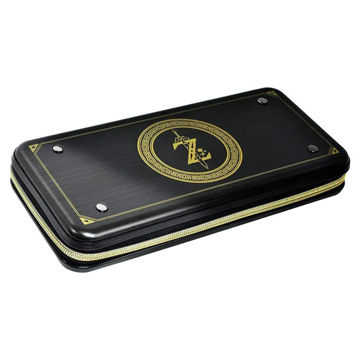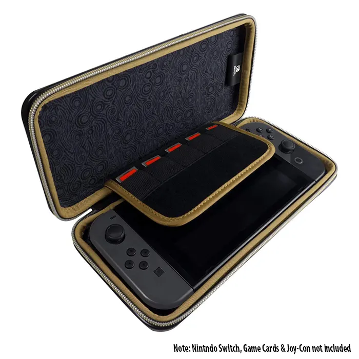 environments, enclosing your Console in a sleek Black and Gold brushed aluminum hard shell. Includes a padded pocket for storing games and accessories. Officially Licensed by Nintendo.