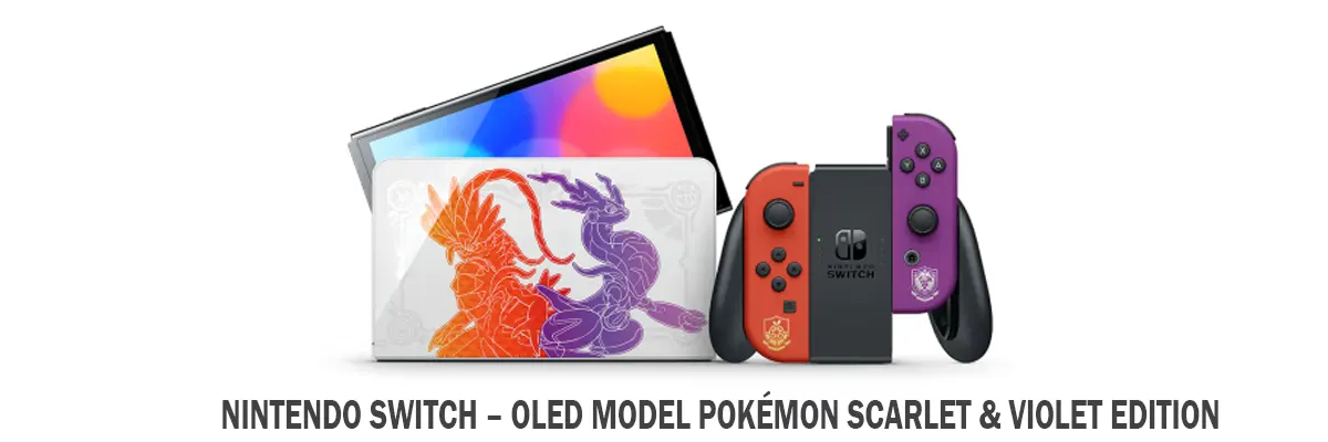 The Nintendo Switch – OLED Model: Pokémon Scarlet & Violet Edition system features special illustrations of the Legendary Pokémon appearing in the Pokémon Scarlet and Pokémon Violet games, Koraidon and Miraidon, as well as the partner Pokémon Sprigatito, Fuecoco, and Quaxly.