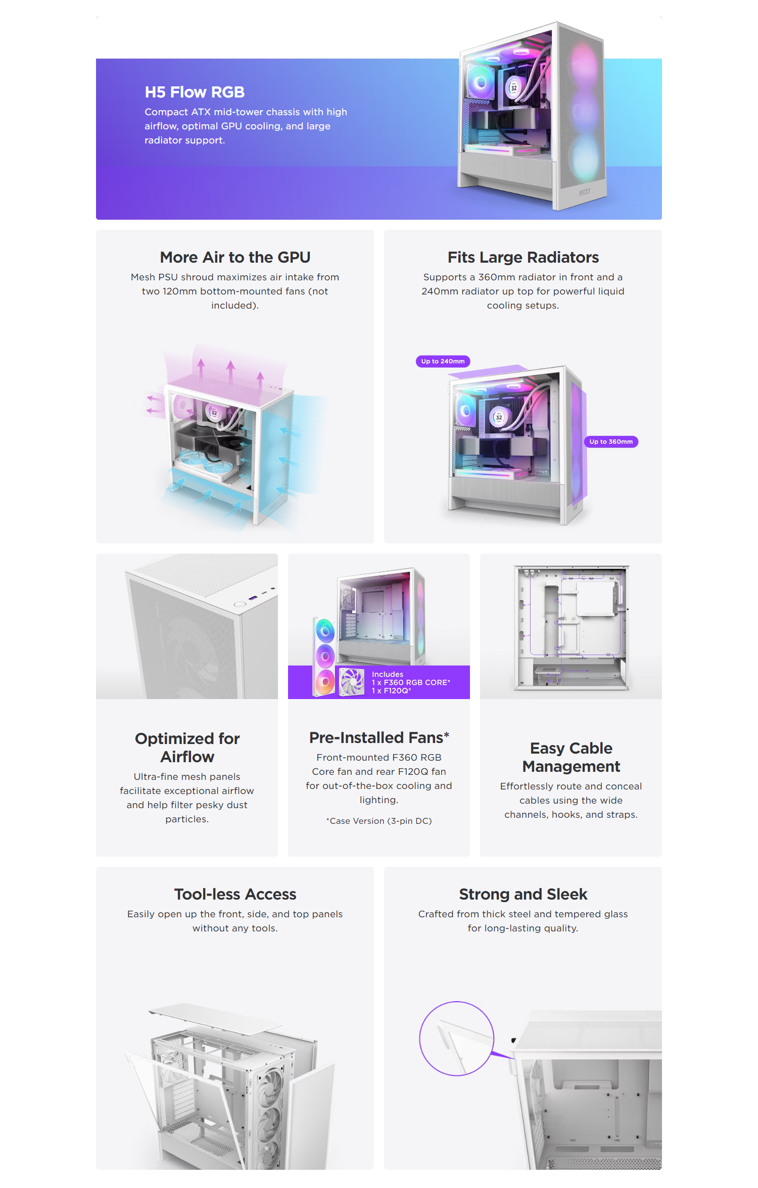 The H5 Flow RGB boosts airflow and GPU cooling with its perforated PSU shroud, mesh panels, and large radiator support—all in a compact mid-tower form factor.