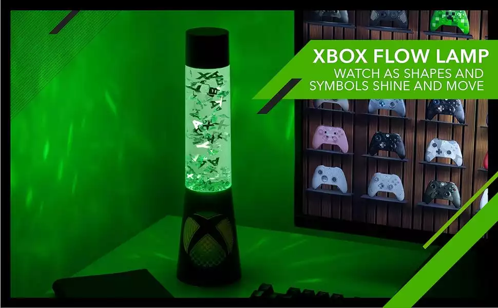 Light up your collection and show your passion for gaming! This themed lamp features all the gaming icons you love. Watch as they drift, flow and sparkle inside your Xbox Flow Lamp.