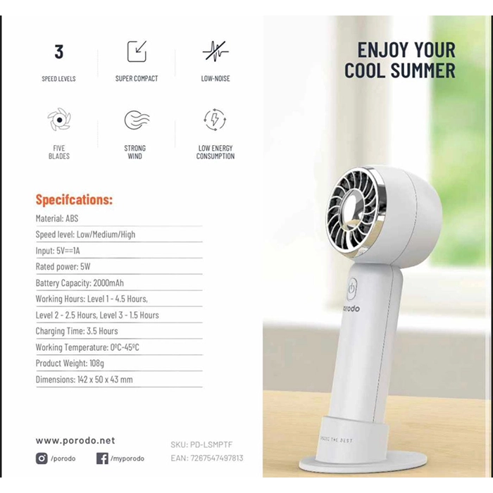 Product NamePorodo Lifestyle Portable Handheld Turbo Cooling Fan 5w 2000mah