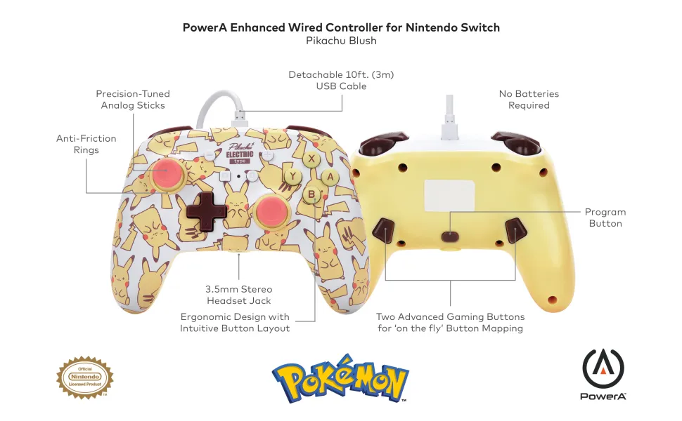 Officially licensed by Nintendo, the PowerA Enhanced Wired Controller for Nintendo Switch combines beauty and performance. A charming pattern inspired by everyone's favorite electric Pokémon, this controller will have you smiling every time you pick it up. Program two mappable Advanced Gaming Buttons on-the-fly, plug in your headset for stereo sound, and enjoy smooth thumbstick control thanks to a pair of embedded anti-friction rings. Includes a 10ft (3m) USB cable