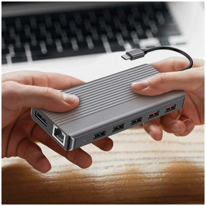 Shop online Powerology 12in1 Usb-c Hub Hdmi Type-c 100w Pd Ethernet Vga Usb Sd Microsd 3.5aux - Dark and free same day delivery from Alfuhod in Kuwait.