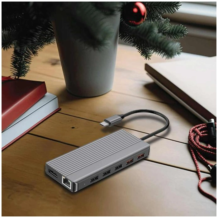 The Powerology 12IN1 Dual HDMI & DP 4K USB-C Hub Ethernet is an all-in-one device that helps you organize all your cable. It offers 12 different outputs with connecting to your device via a USB-C PD100W Input, including 3 USB-C 3.2 ports with 10Gbps high-speed data transfer, multiple HDMI Ultra-HD ports that let you connect 2 displays simultaneously, one 3.5mm AUX audio jack, and SD and Micro-SD memory cart ports. In addition to these beneficial characteristics, it also has an RJ45 Ethernet connector, which guarantees quick, reliable data transmission over Ethernet. This versatile, useful device is compatible with Android, iOS, Windows, and Mac, making it a universal option appropriate for all professionals and gamers who are constantly in need of additional ports and capacity.