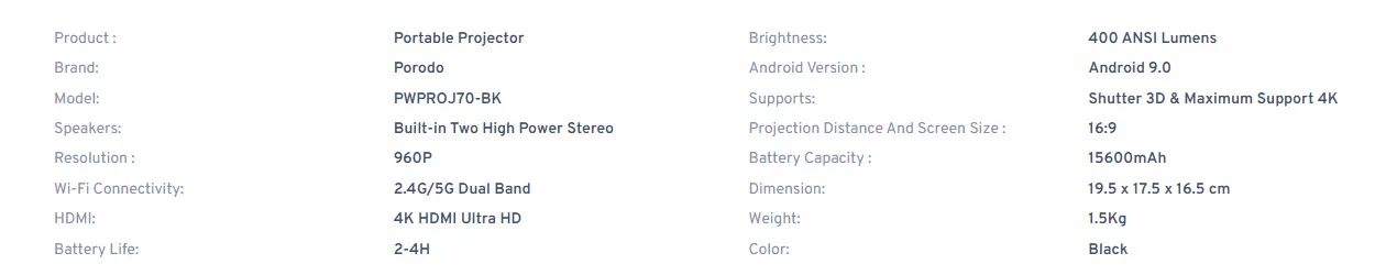 Product NamePowerology 4K Portable Projector Built-in 15600mAh Lithium Battery, Android 9.0, HDMI Ultra HD - Black