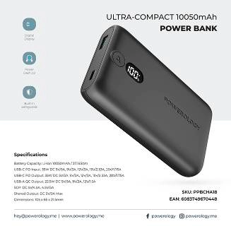 The remarkable Powerology 35W Powerbank is the ultimate portable charging solution for your devices. With its sleek design and impressive features, this powerbank is a must-have for those on the go. Equipped with both USB-C (35W) and USB-A (22.5W) ports with sharing output of 15W, it offers versatile charging options for a wide range of devices, from smartphones and tablets to laptops and gaming consoles.