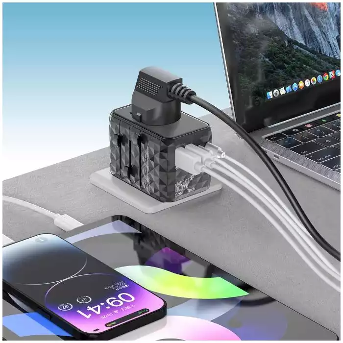 Powerology Universal Multi-Port Travel Adapter with 2 USB-A, 3 USB Type-C ports, and EU/UK/US/AUS plug options is a universal compatible charging adapter which has the ability to charge multiple devices simultaneously. It supports PD65W Power Delivery Technology that charges your device from 0% to 60% in just 35 minutes and due to this rapid charge feature, it ensures fast charging for laptops and other devices. The GaN technology enables a compact, lightweight design, saving luggage space. The adapter's versatility and high-quality build features make it a reliable choice. Standing out from traditional adapters, it offers a comprehensive charging solution, eliminating the need for multiple chargers. With its future-proof design, this GaN-based adapter sets a new standard for travel charging convenience.