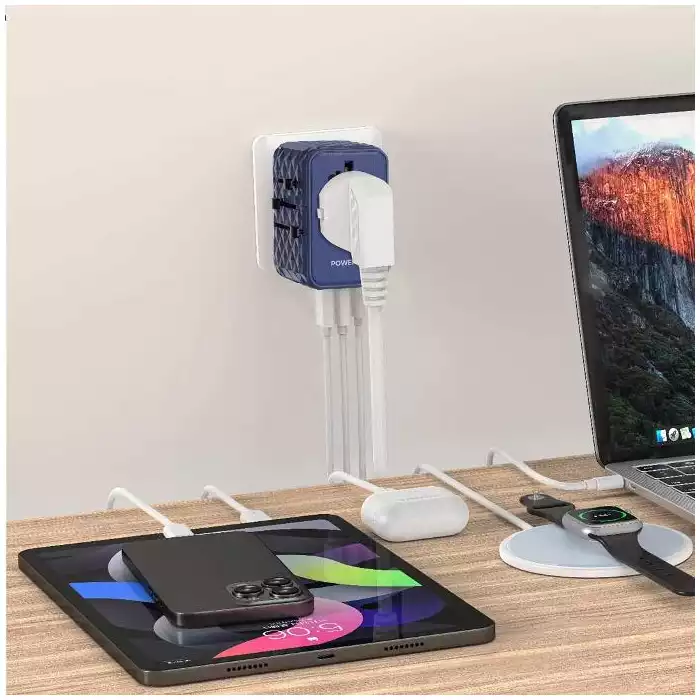 Shop online Powerology Universal Multi-port Travel Adapter Pd 65w ( 3x Type-c / 2x Usb-a Ports ) - Blue and free same day delivery from Alfuhod in Kuwait.