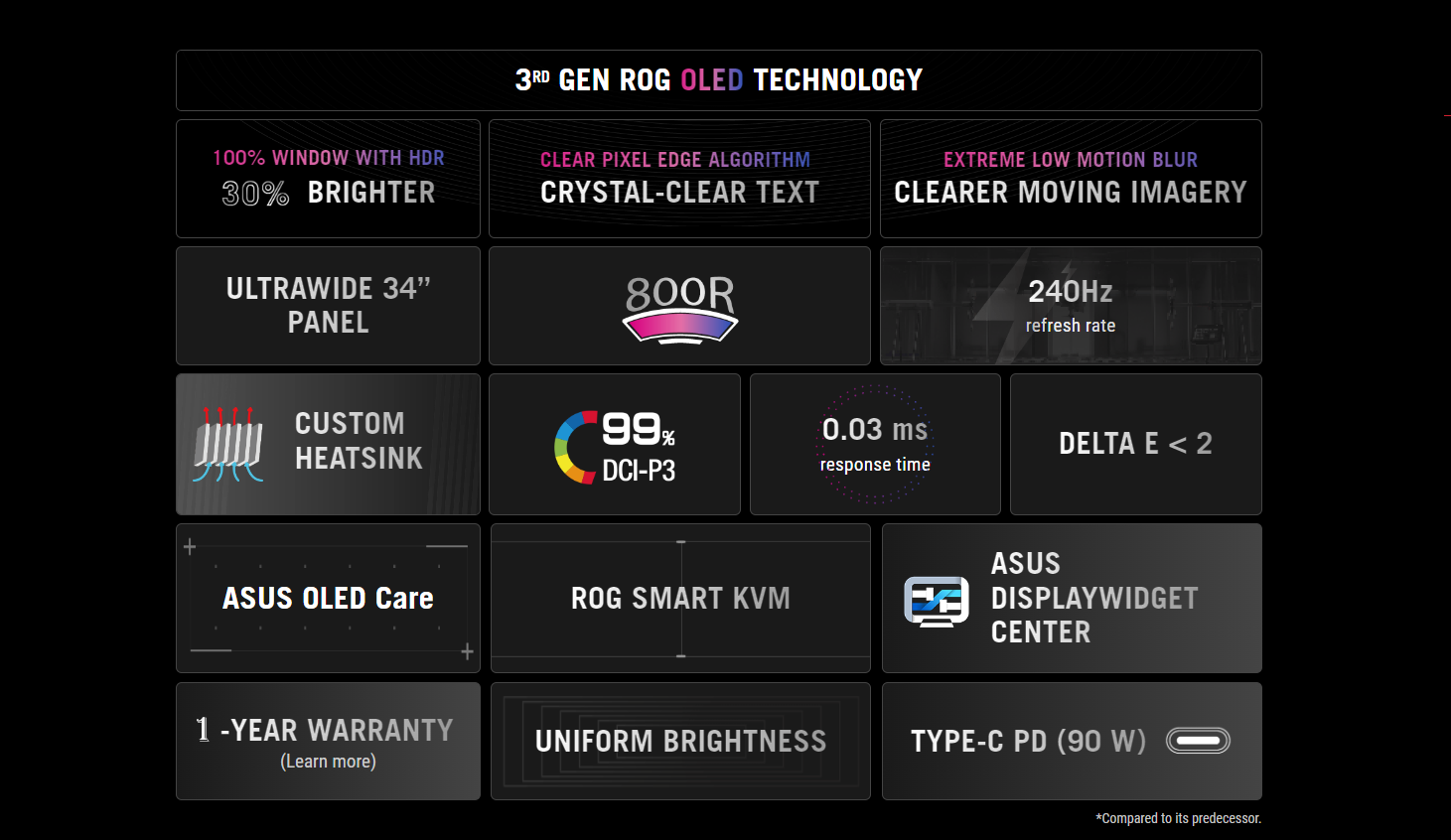 Push the limits of gaming with ROG Swift OLED PG34WCDM ultrawide curved gaming monitor. It features a 34-inch 3rd generation ROG OLED technology panel that offers 30% brighter imagery compared to its predecessor with 100% window in HDR, color-fringing reduction, and ASUS Extreme Low Motion Blur (ELMB) technology. A 240 Hz refresh rate and typo 0.03 ms gray-to-gray (GTG) response time ensure incredibly immersive virtual worlds without motion blur or screen tearing. Plus, an advanced custom heatsink design reduces the risk of burn-in to improve performance and longevity of the OLED panel.