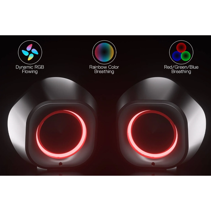 BACK VIBE RGB The refreshing design of psychedelic ambient RGB light on the back of the speakers delivers an attractive mystery gaming vibe. 3 modes are selectable for different ambiances by touch control, switching off the light is also available.