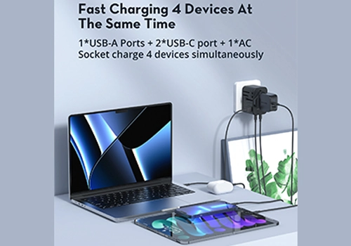 Charge multiple devices This charger comes with 1*USB-A Port, 2*USB-C Ports and 1*AC Socket so that you can charge upto 4 devices with this advanced charger at the same time.